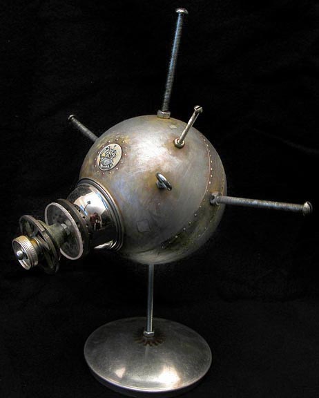 Satellite is constructed from metal containers and hardware, with hand painted robot commander