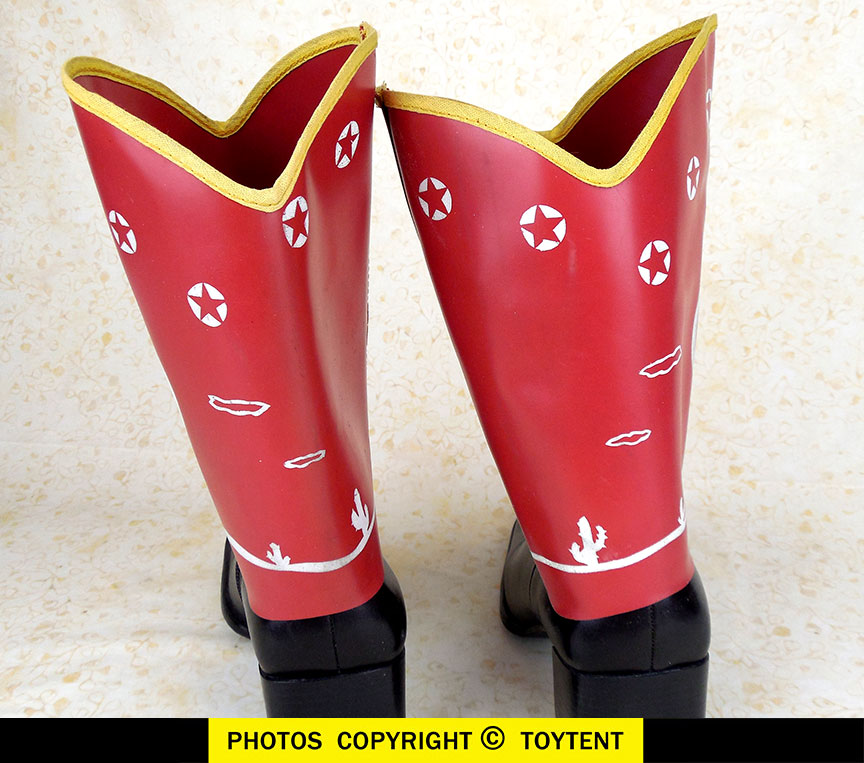 Ankle height red vinyl boot chaps are about 9" high with yellow trim and metal studs at each seam