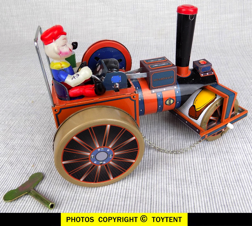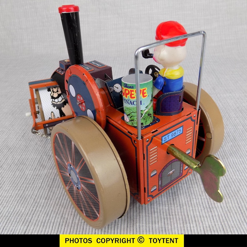 Mechanical tin toy steamroller with celluloid Popeye the Sailorman at the wheel ... SEE MOVIE!