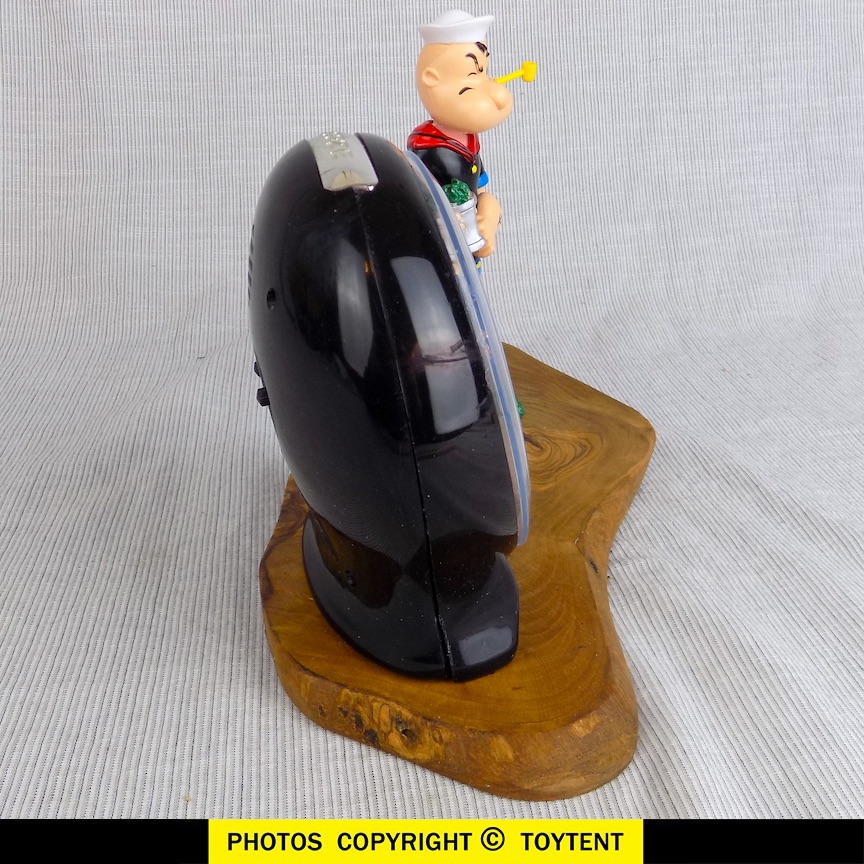 - Battery operated alarm clock features Eugene the Jeep, Olive Oyl, Bluto and Swee'Pea -- clock is in working condition with alarm and snooze button, has some light wear as shown in detail photos