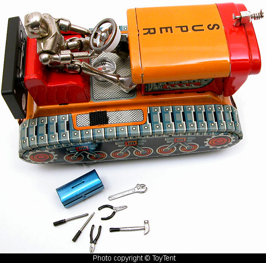 - Tractor is 7" long, excellent working condition, all tin construction with metal robot driver and toolbox