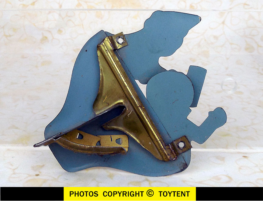 Hand-held mechanical tin clicker toy is about 3-inches wide