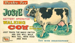 - Professional quality reproduction box for the battery operated walking cow with mooing voice made in Japan by Rock Valley Toys and imported by Rosko