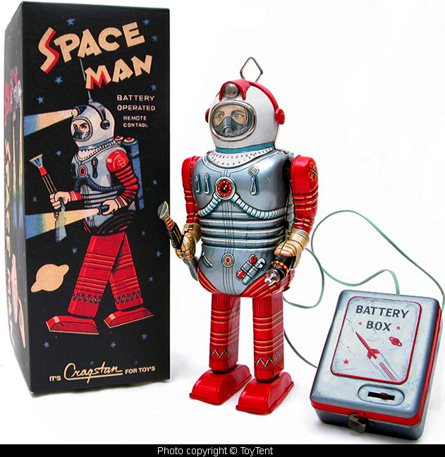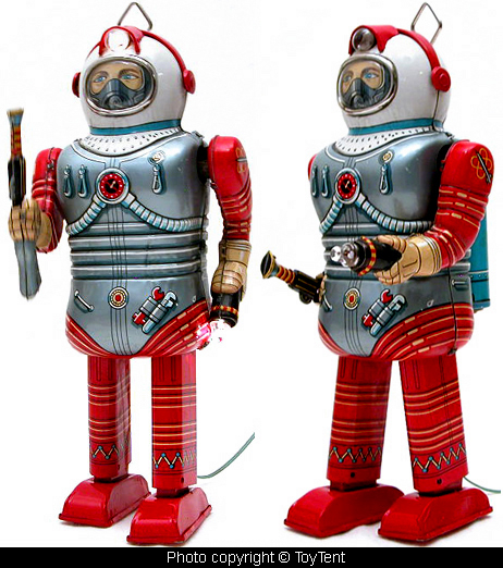 Astronaut explorer robot with lighted helmet, space gun and flashlight