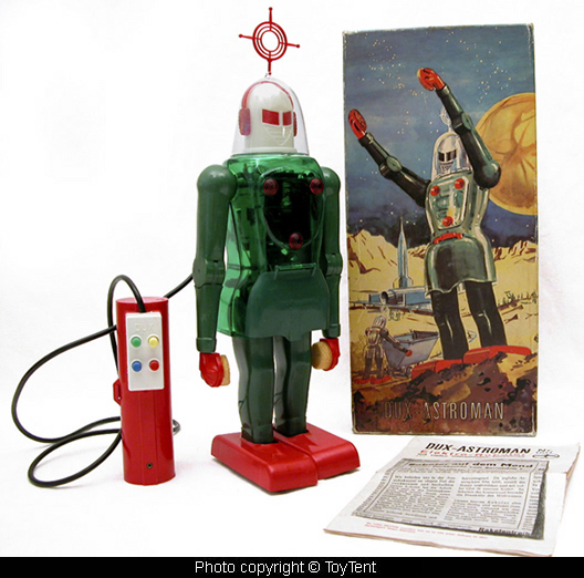 Plastic construction with glow-in-the dark head, clear plastic helmet with red antenna and headphones, transluscent green body with hinged skirt, light in chest