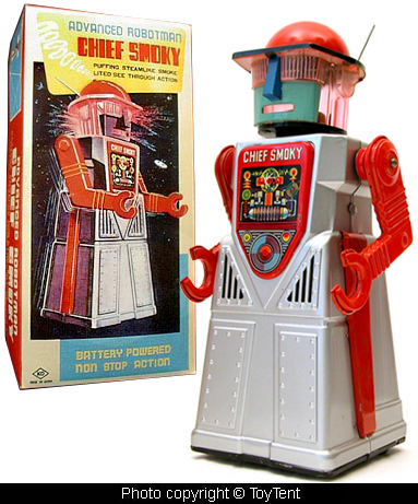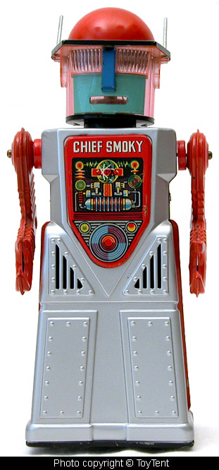 Battery operated skirted robot with bump-n-go action, lighted head, and smoke blowing helmet