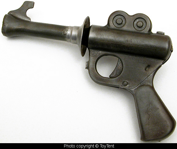 Space pistol is in good condition with wear from age; metal lanyard loop is missing from bottom of grip, but gun is in working condition -- still makes a loud pop