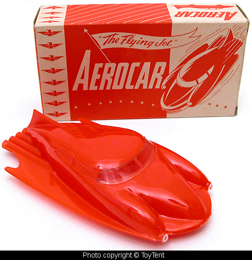 Aerocar is all plastic construction, 7.5" long, wheeled vehicle