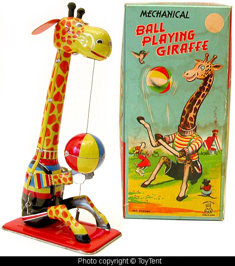 Mechanical giraffe with ball that moves on string, overall 9" tall