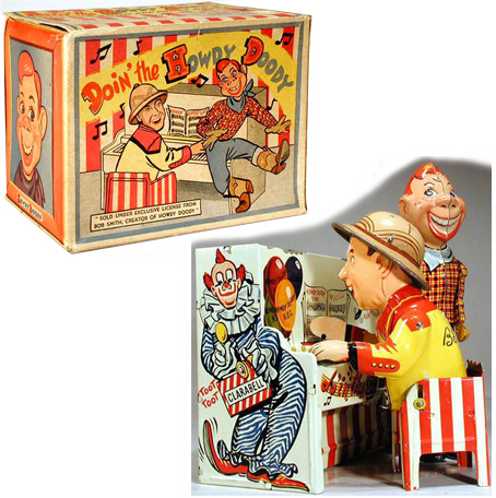 Tin wind-up piano band toy with Howdy Doody and Buffalo Bob