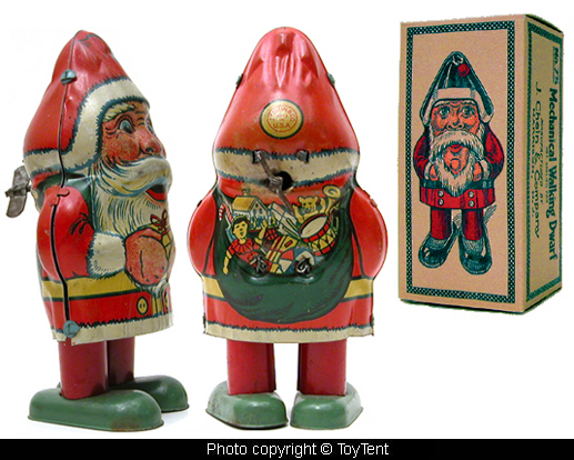 Two versions of the mechanical Christmas Dwarf were made by the J. Chein Co. in the 1930s, this version with gift and toy sack is the design also used for the rare Chein Santa Bank