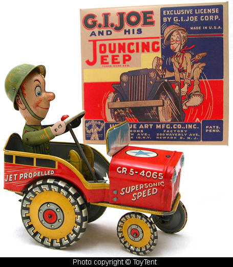 Jeep goes forward and back and whirls around; GI Joe lurches forward in his seat and his helmet drops down over his eyes