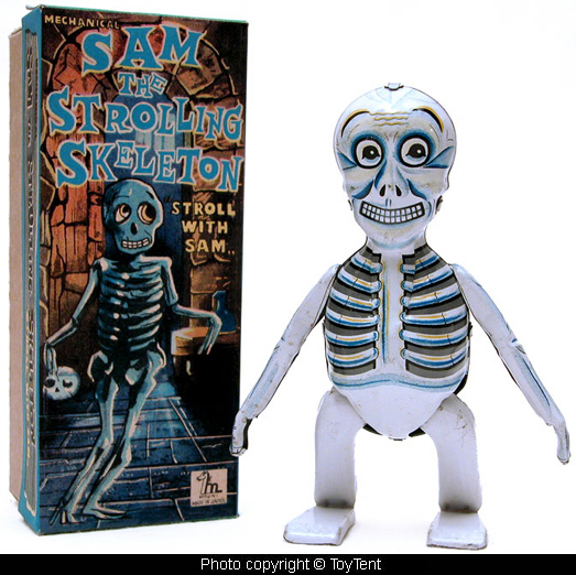 Skeleton Sam is 5.5" tall, all tin with built-in key
