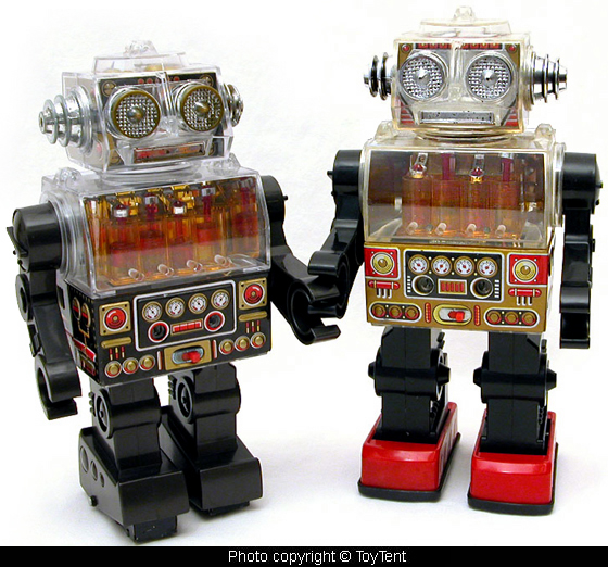- S.H. Piston robot has black plastic feet that move with a realistic walking effect. SJM Piston robot has red metal feet