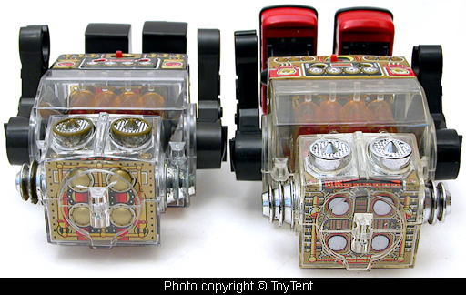 - S.H. robot's chest is see-through both in front and back, the SJM robot has lithographed tin across the back