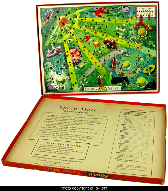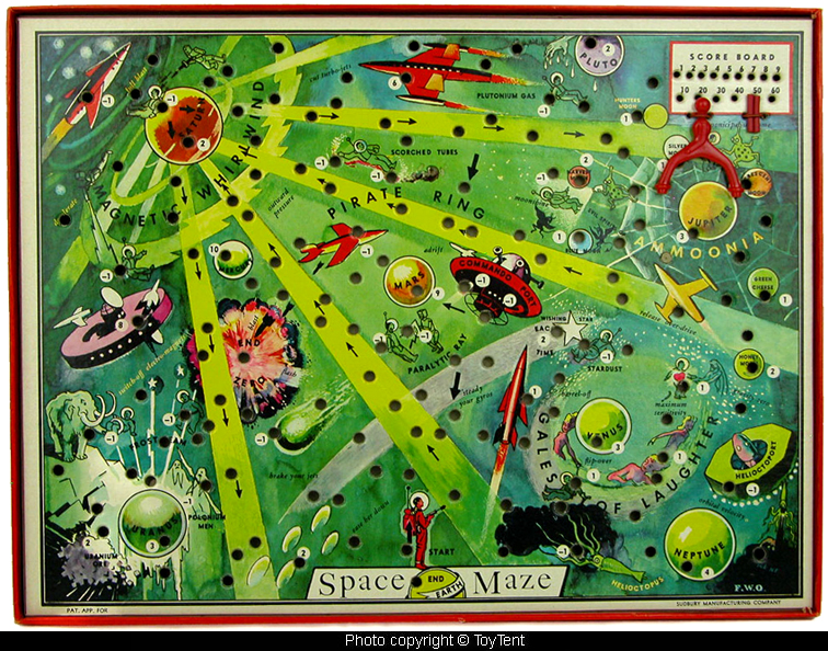 Vintage space maze board game with unique spanner playing piece and scoring strategy