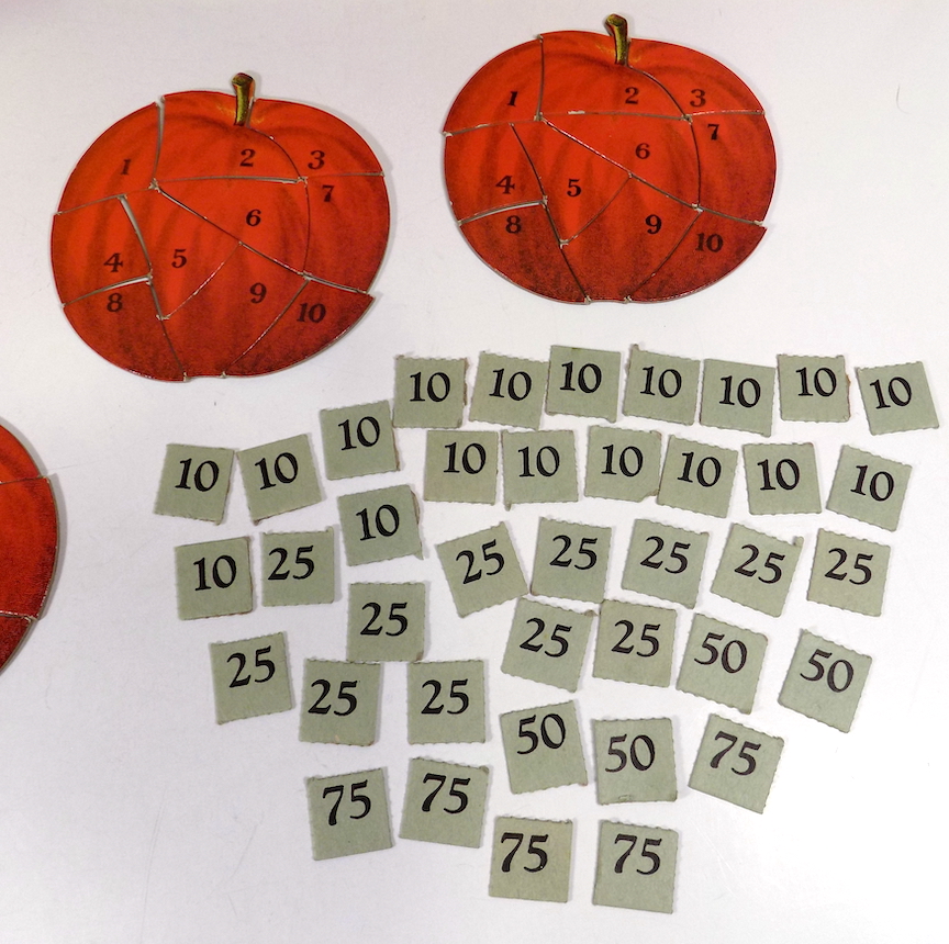 To play, spin the Big Apple, take a token for the points you landed on ... when you have 100 points you can buy a piece of the apple