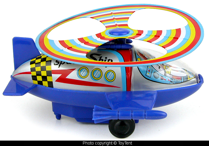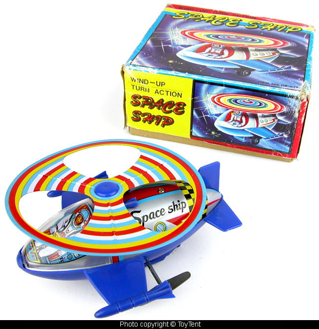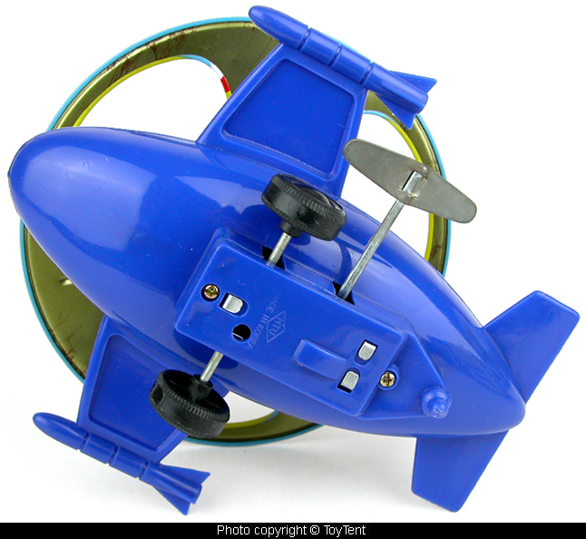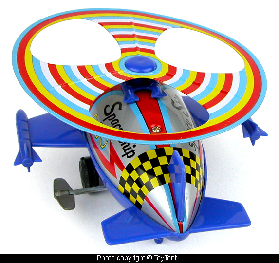- Space ship has plastic base with lithographed tin whirly top spinning propeller, about 7 inches long with built-in key