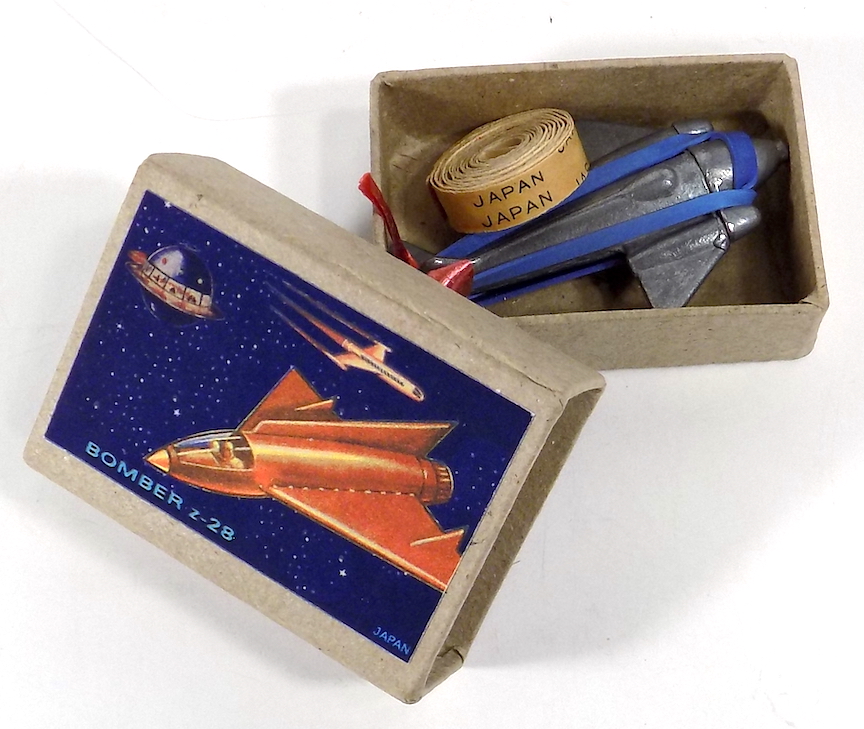 Metal rocket is 2" long, excellent condition