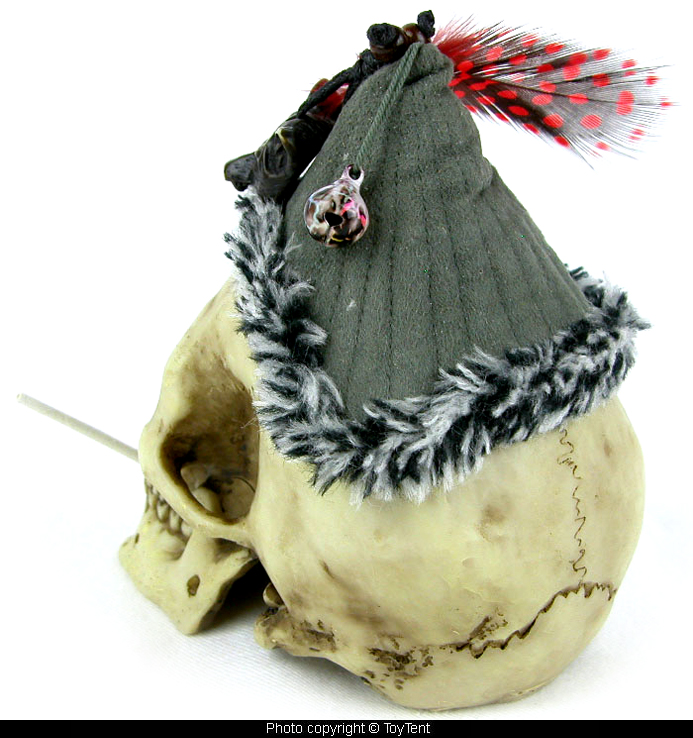 Super realistic skull is 5" tall with Genghis Khan mongol warrior cap and feather